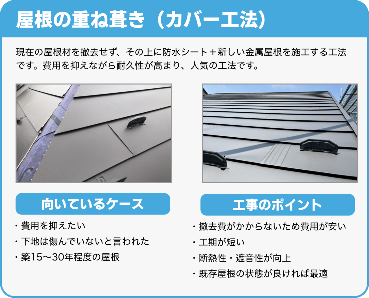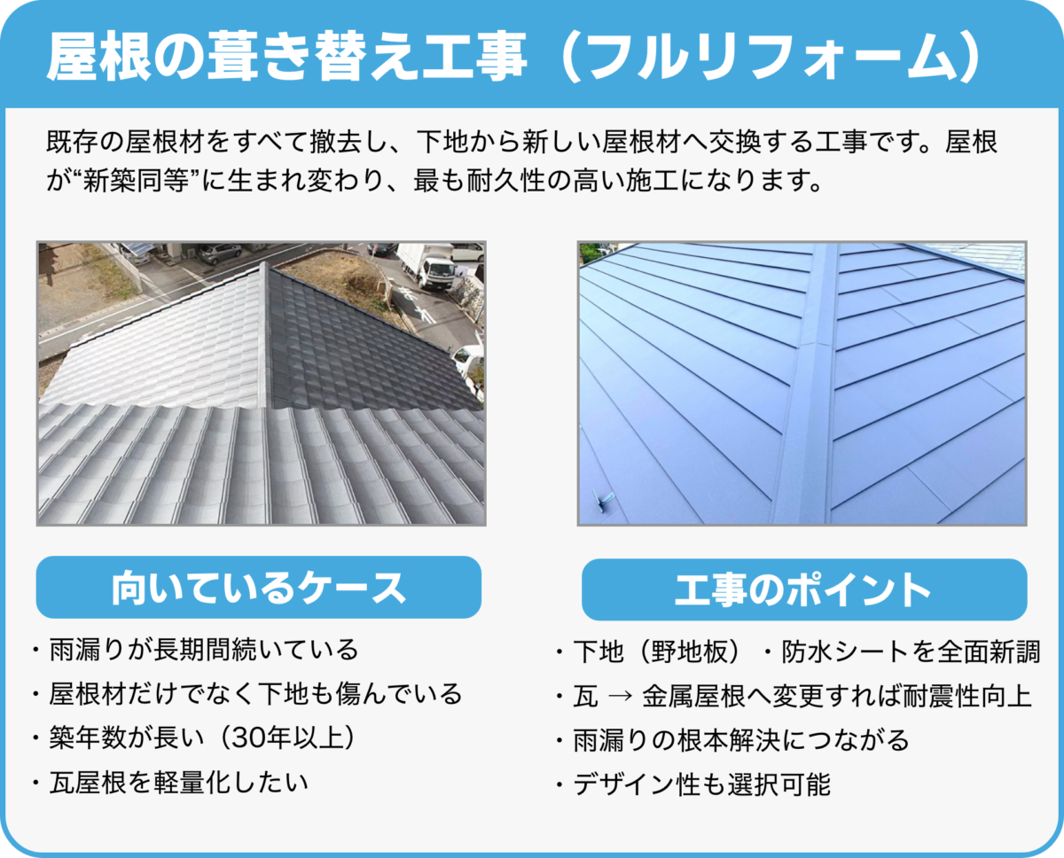 A:無料点検で屋根裏・下地の状態を調査し、葺き替え・カバー工法・部分補修のいずれが最適かご提案します。