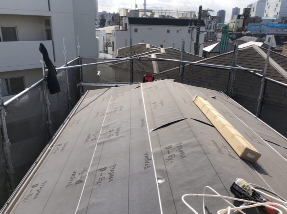 既存の棟板金を撤去し、改質アスファルトルーフィングを施工します。