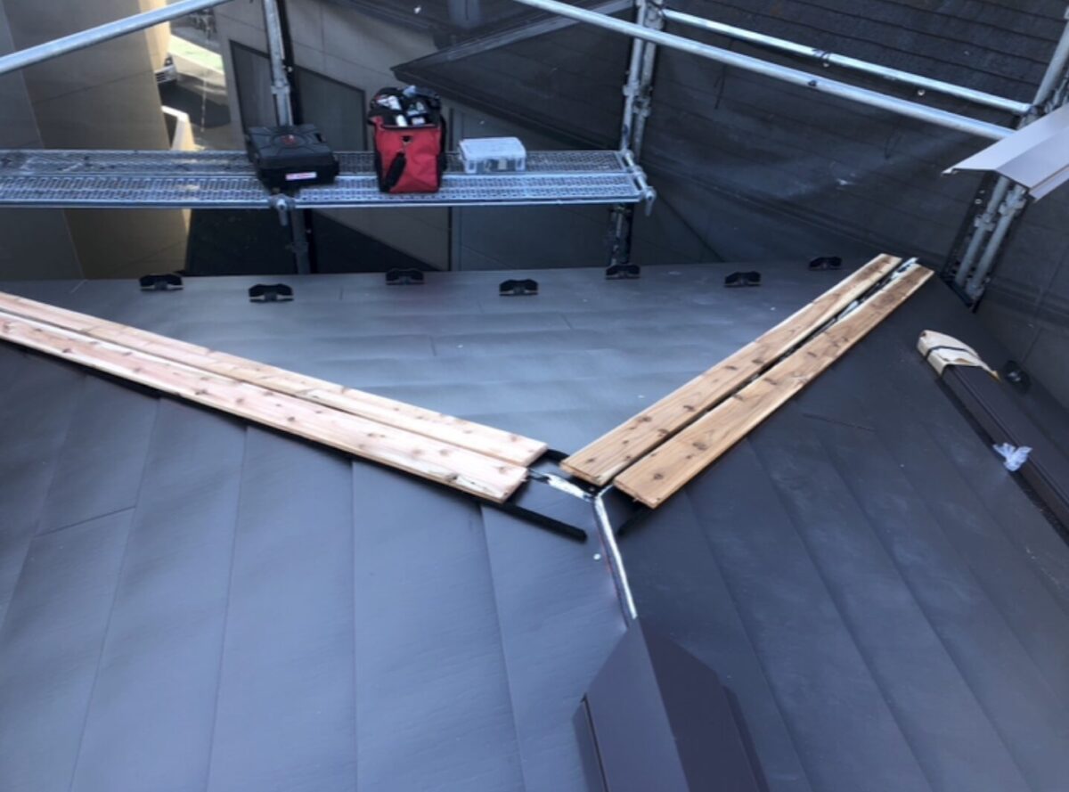 ルーフィング施工後、屋根材を上から葺いていきます。