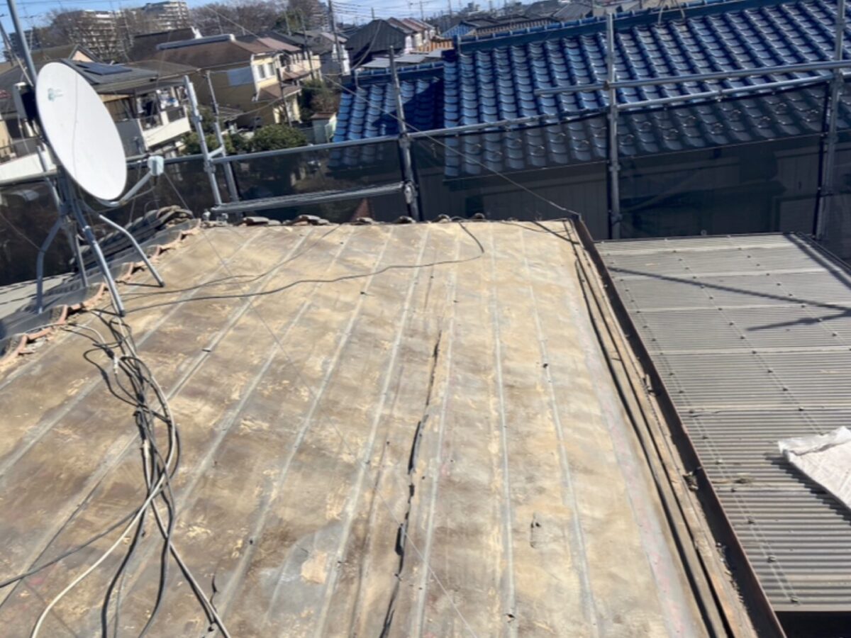瓦を撤去した後、瓦桟を取り外して屋根面を清掃し、