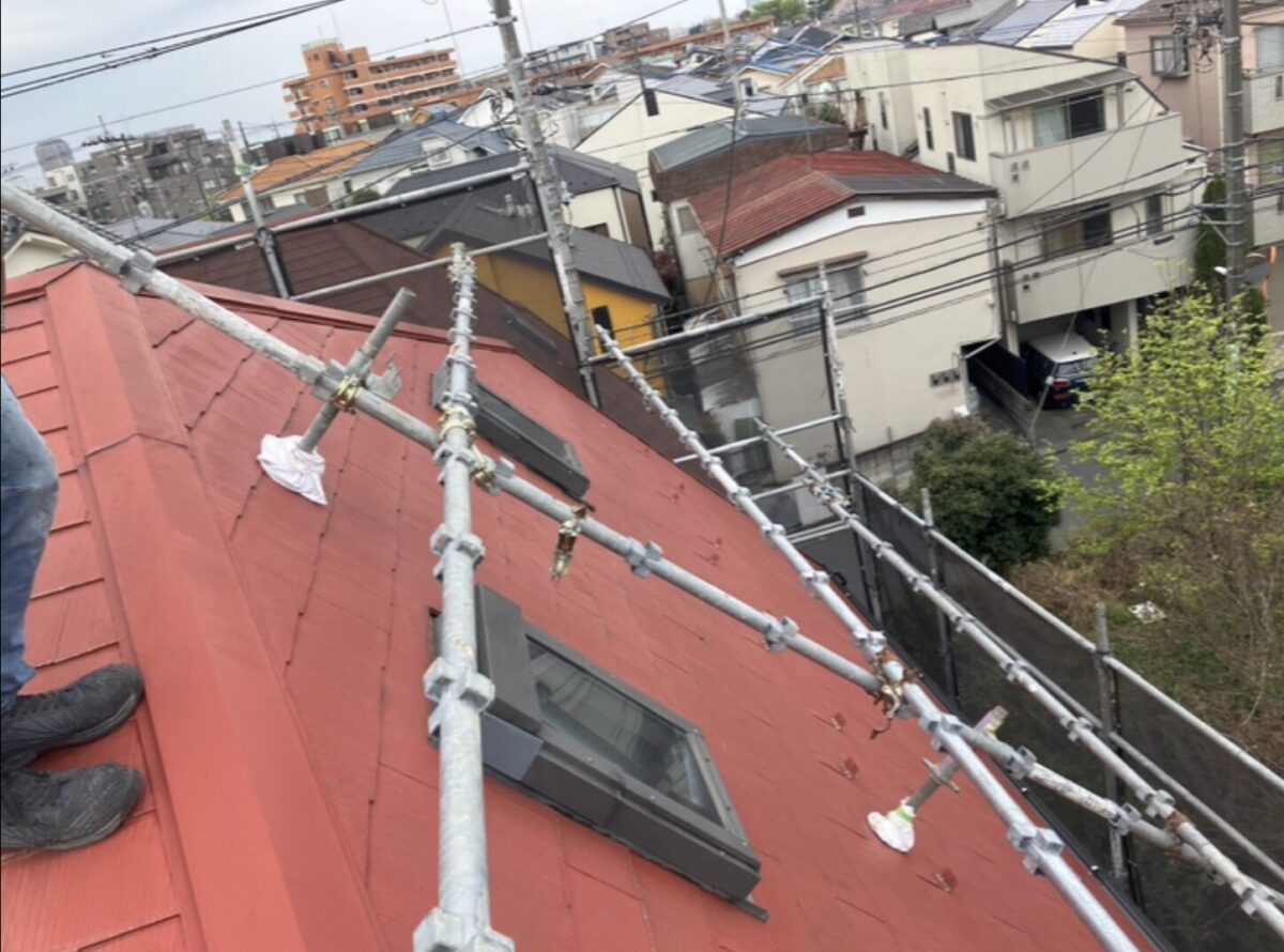 急勾配屋根のため、屋根足場を設置したうえで安全に作業を行っています。