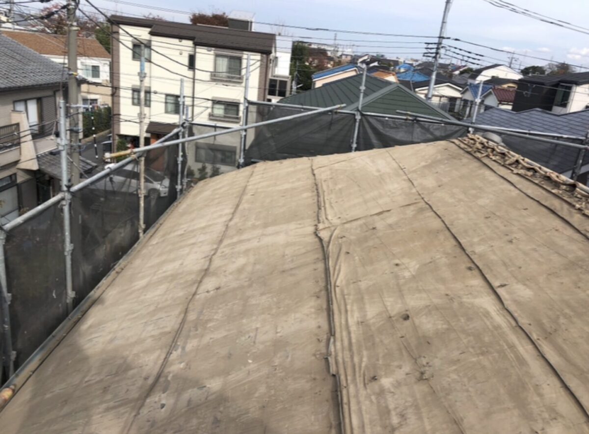 瓦撤去後は、屋根全面に野地板を施工しました。