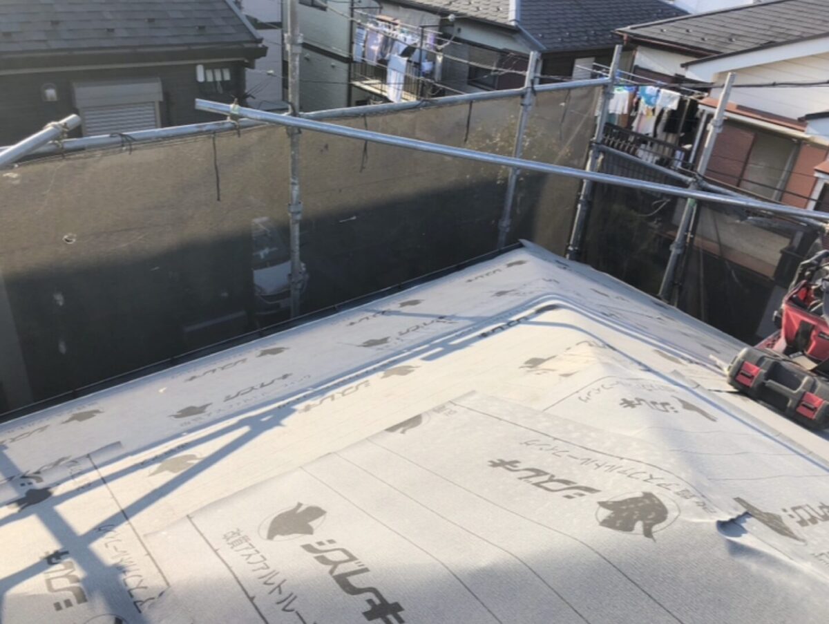 野地板の施工後、防水性を確保するためルーフィングを全面に施工しました。